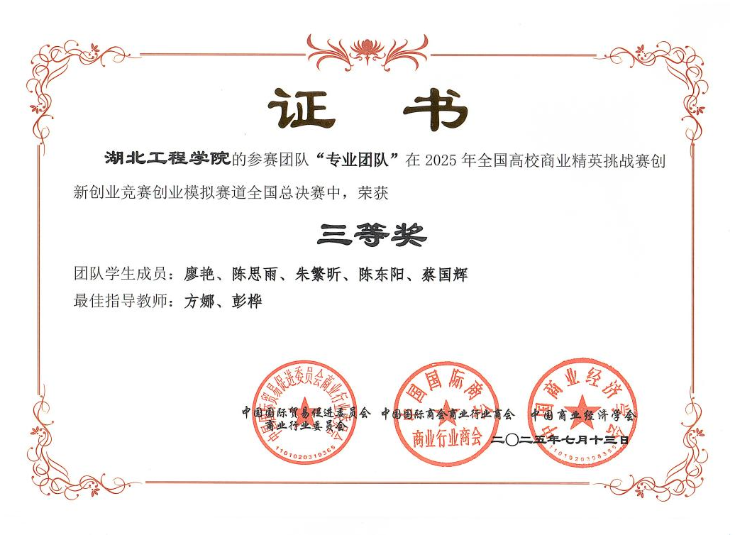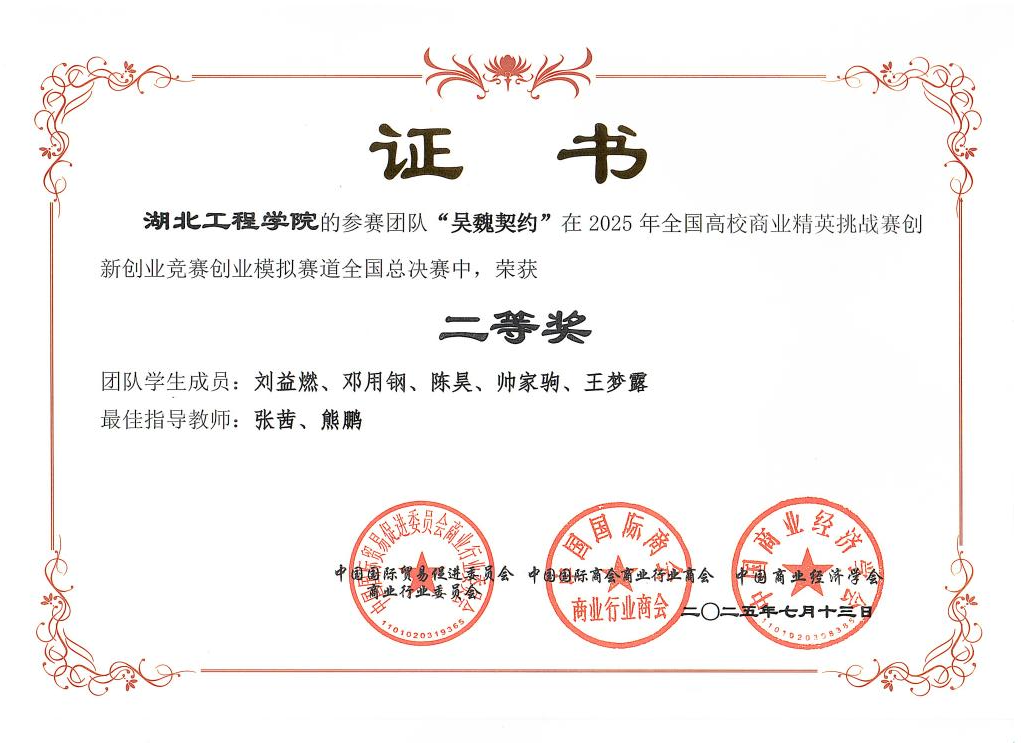 在创业模拟赛道,刘益燃、邓用钢、陈昊、帅家驹、王梦露等同学组成的“吴魏契约”团队荣获全国二等奖(指导老师:张茜、熊鹏);由廖艳、陈思雨、朱繁昕、陈东阳、蔡国辉等同学组成的“专业团队”团队荣获全国三等奖(指导老师:方娜、彭桦)。