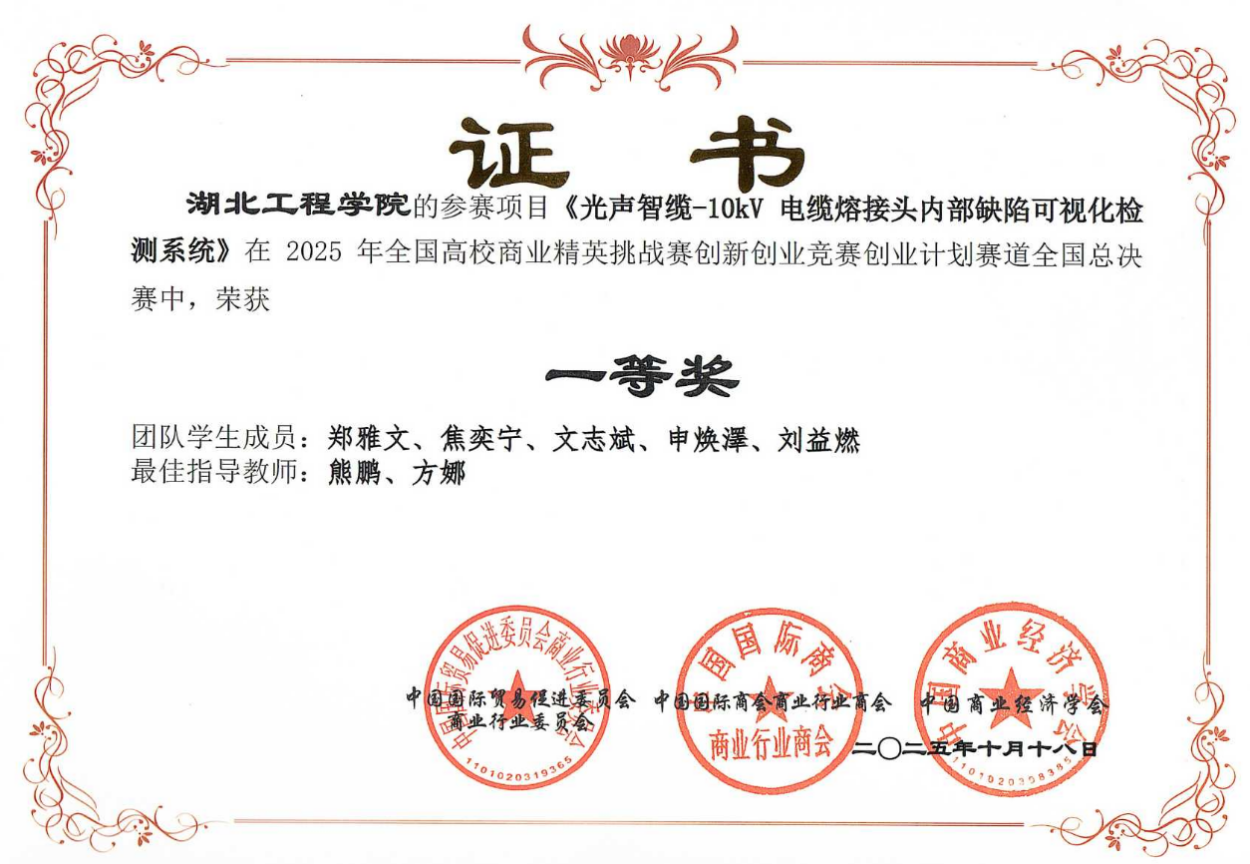 公司参赛团队在公司的大力支持与指导老师的精心培育下,凭借优秀的项目设计、扎实的调研数据和出色的现场表现,在多个赛道中脱颖而出,成绩喜人。在创业计划赛道,郑雅文、焦奕宁、文志斌、申焕澤、刘益燃等同学完成的项目《光声智缆-10kV电缆熔接头内部缺陷可视化检测系统》荣获全国一等奖(指导老师:熊鹏、方娜)。