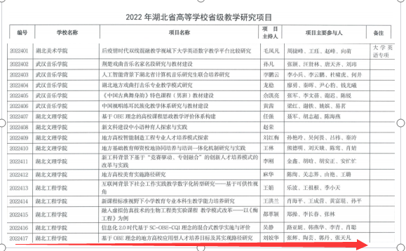 近日,湖北省教育厅发布了《省教育厅关于公布2022年湖北高校省级教学研究项目的通知》,刘姣华老师主持的《基于OBE理念的地方高校应用型人才培养目标及其实现路径研究》喜获2022年省级教学研究项目。