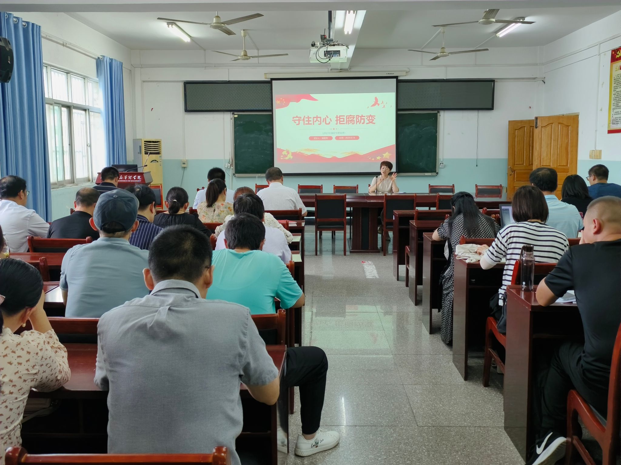 9月14日下午,公司党委书记刘莉萍在经法楼401会议室为全体教职工讲廉政党课——《守住内心 拒腐防变》。