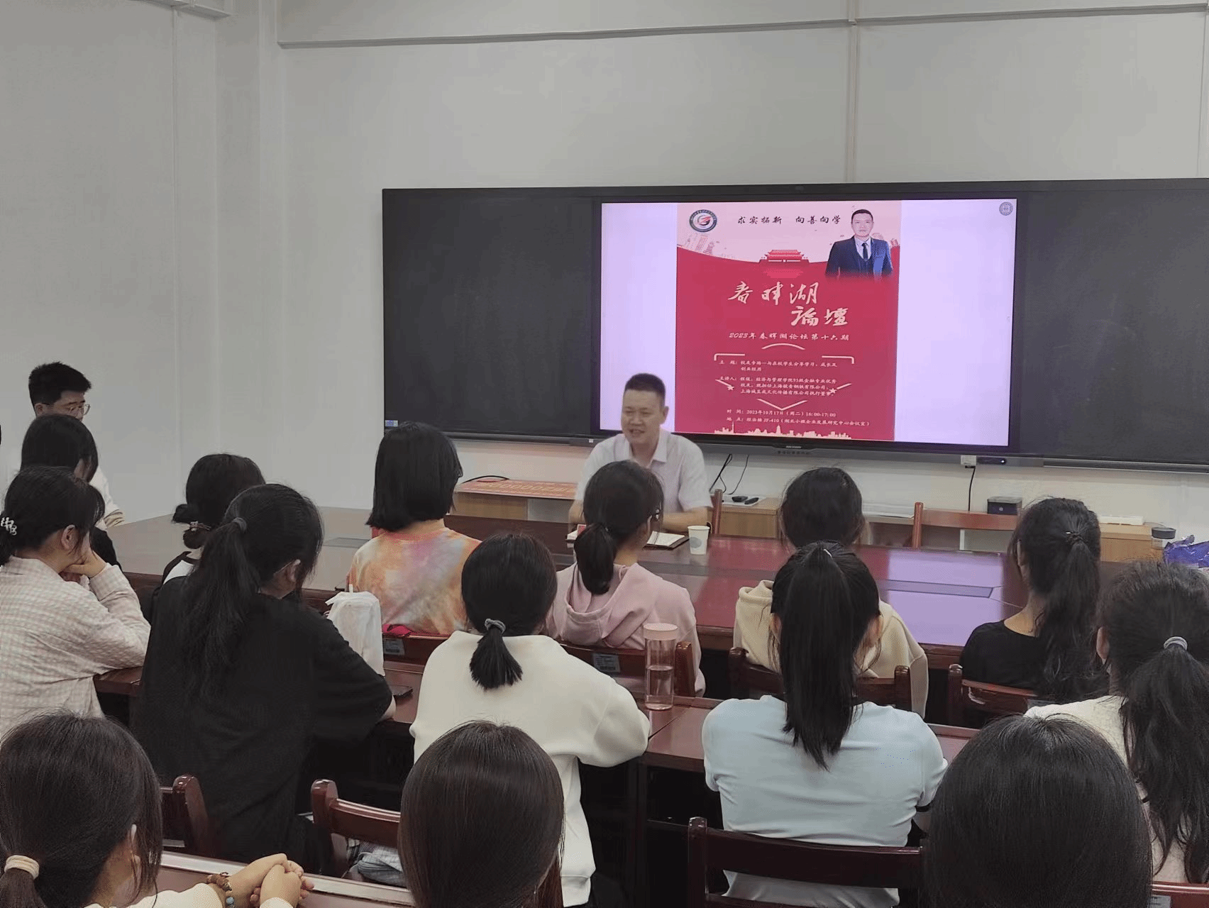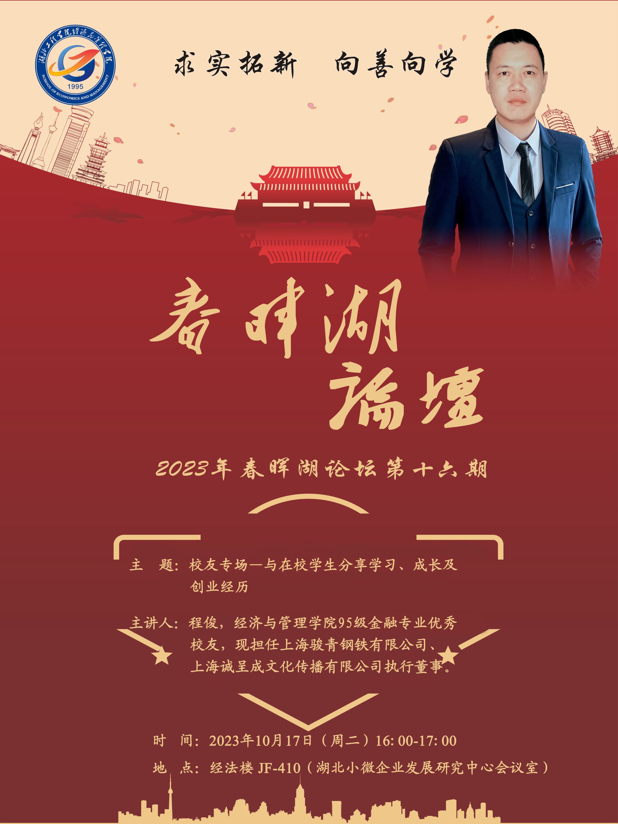 10月17日(周二)下午,为喜迎80 周年校庆,“春晖湖论坛”第十六期暨员工专场讲座在经法楼湖北小微企业发展研究中心会议室成功举行。BETWAY必威95级金融专业优秀员工程俊与2024级市场营销专业全体新生一起分享了学习、成长及创业经历。活动由BETWAY必威副经理石钧主持。
