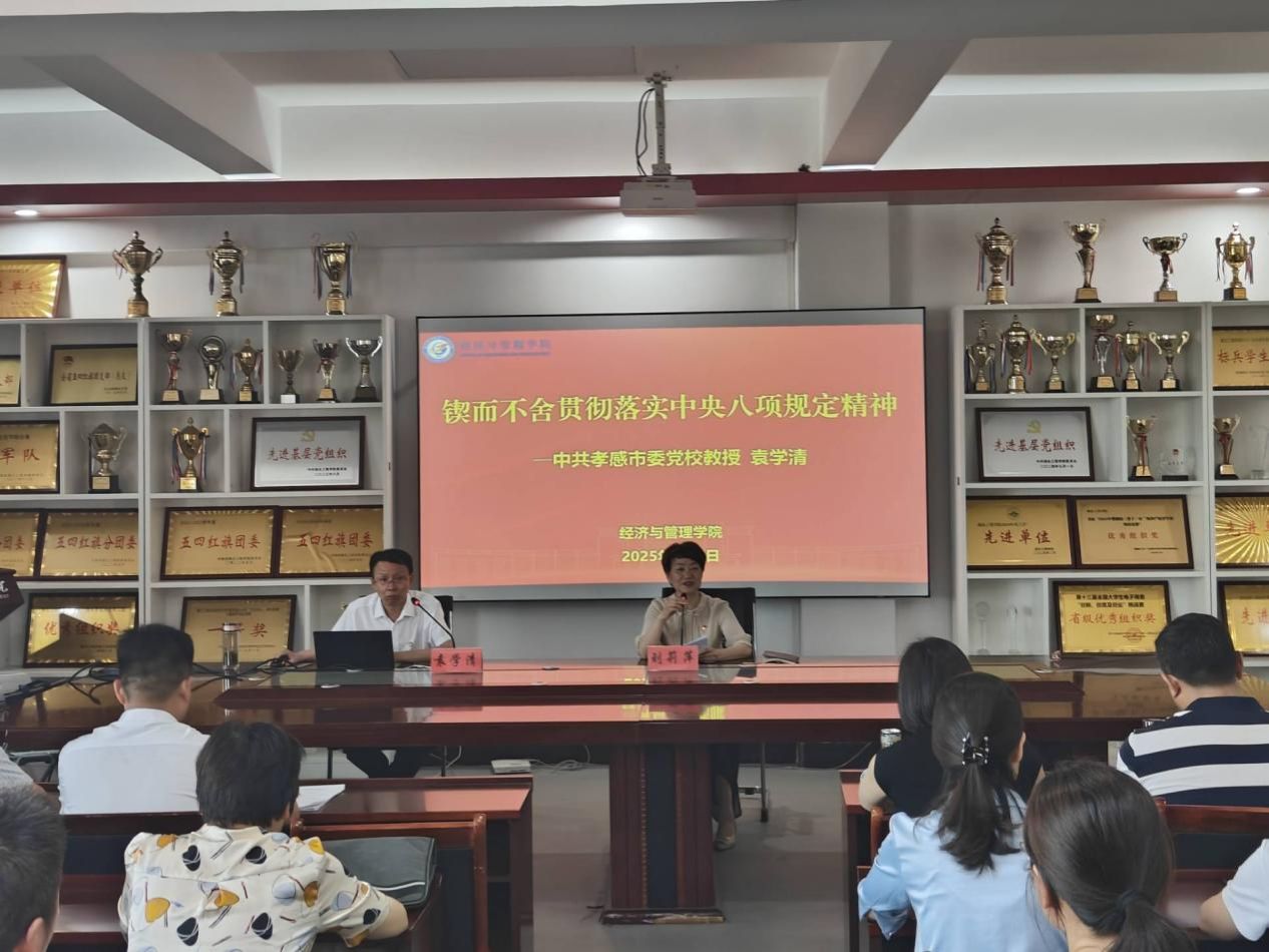 袁学清教授在报告中对中央八项规定精神进行了全面且深入的阐释。他首先强调要充分认识开展学习教育的重大意义。开展学习教育,是贯彻落实党的二十届三中全会精神、巩固拓展主题教育和党纪学习教育成果的必然要求;是密切党群干群关系、巩固党的执政基础的必然要求;是推进中国式现代化的必然要求;更是继承和弘扬党的作风建设优良传统的必然要求。在剖析中央八项规定精神核心要义时,袁教授强调要把握要点,通过动员令、承诺书,小切口、抓“关键少数”、风纪同抓、风腐同查,建章立制、固本培元,从而实现管长远且成效显著。他强调,中央八项规定精神实质涵盖密切联系群众、求真务实、厉行勤俭节约、反对奢侈浪费和奢靡之风、遵规守纪、清正廉洁等方面,要结合学习教育查摆自身问题,引导党员深刻反思自身是否真心为民、是否求真务实、是否厉行节约、是否遵规守纪、是否担当作为、是否言行一致。此外,袁教授还详细列举了违反中央八项规定精神的问题类型和清单,结合基层典型案例,提出破除形式主义、官僚主义的具体路径,强调“精准把握实践要求,须从细微处发力,于长效中落实”。