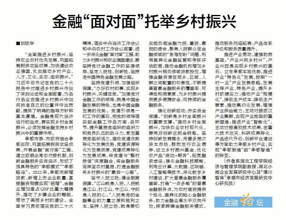 她谈到:习近平总书记在党的二十大报告中提出了“全面推进乡村振兴,扎实推动乡村产业、人才、文化、生态、组织振兴”的思想,结合孝感市委、市政府提出的“巩固拓展脱贫攻坚成果,开展金融‘面对面’工程”,进行了深入思考,认为金融是现代经济运行的血液,要实现乡村全面振兴,必须发挥金融支持乡村振兴中的重要作用。全面学习贯彻落实党的二十大精神,落实中央经济工作会议和中央农村工作会议部署,进一步深化金融“面对面”工程,助力乡村振兴和农业强国建设,要坚持党对金融工作的坚强领导,坚定人民性、创新性,坚持走中国特色金融发展之路。