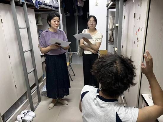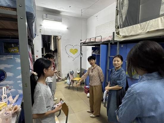 走访中,老师们化身“安全巡查员”与“贴心家人”。他们一面仔细检查宿舍的用电设施、排查是否存在安全隐患,一面与同学们亲切交谈。“晚上睡着冷不冷?”“食堂吃得惯吗?”“来自哪里?”一句句暖心拉家常,迅速拉近了师生距离。在轻松的氛围中,老师们将“严禁使用违规电器”“出门随手锁门”等安全须知融入日常叮嘱,让安全教育在潜移默化中入脑入心。