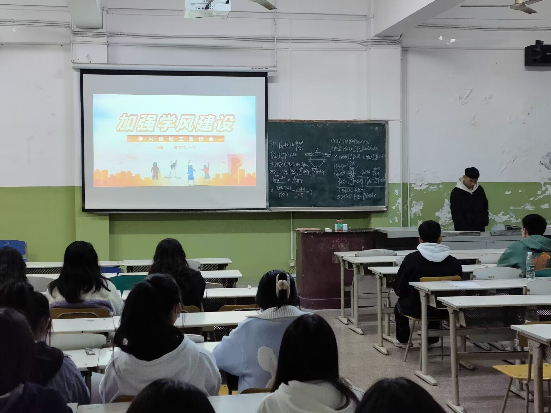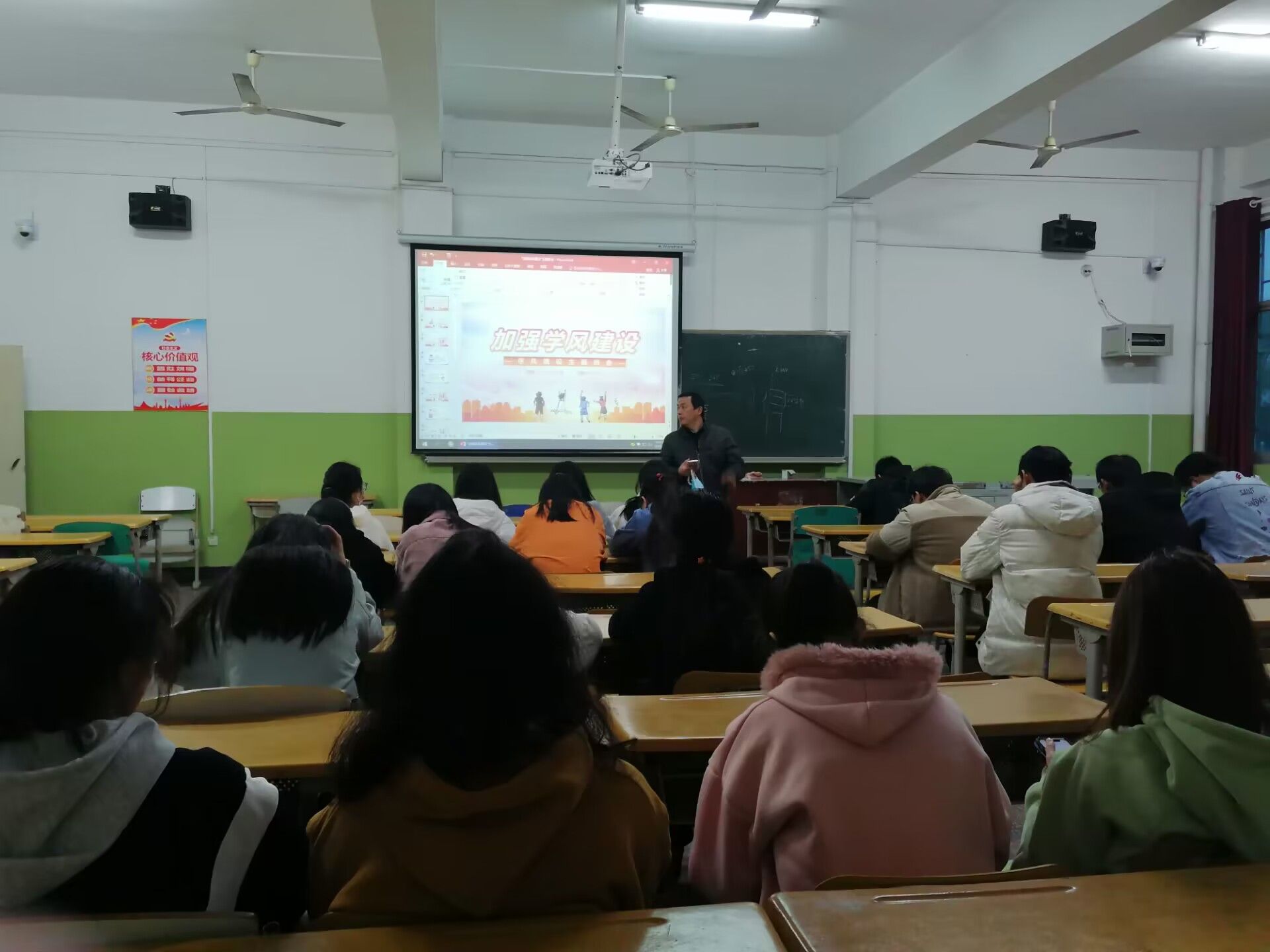 班会上,班主任以PPT的形式首先介绍了学风的含义以及良好学风的重要意义,强调学风建设的严肃性和重要性,阐明了公司学风现状,分别从考试方面、考勤方面和晚自习方面分析存在的问题。接着各班主任提出加强学风建设的方案,要求员工首先从思想上端正态度,改变想法,结合自身情况制定方案;其次,可以寻找学习伙伴,互相监督,营造良好的学习氛围,要合理规划大学四年学业生涯,树立学习目标。最后,各班在班主任的带领下确立了班级年度目标,如四六级通过率、计算机二级通过率、获得奖学金人数、获得文明寝室数等,激励每个员工奋发向上,为实现班级目标和个人目标而努力。