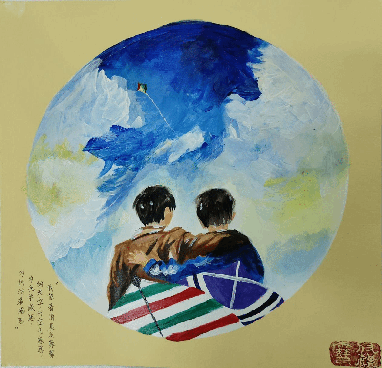 “我望着清晨灰蒙蒙的天空,为空气感恩,为光芒感恩,为仍活着感恩”语出卡勒德·胡赛尼的《追风筝的人》。阿米尔自幼家境优渥,但是一场战争让他和父亲成了逃亡的难民。难途中,他和父亲甚至不得不屈身于黑暗、拥挤且闷热的油罐车中。下车后,阿米尔重见清晨的阳光,发出了对生命的感恩。作者结合“感恩长存,励志青春”的主题,创作了一幅温暖阳光的青春画卷,希望每个心怀风筝的人都能怀感恩之心,勇敢追梦。